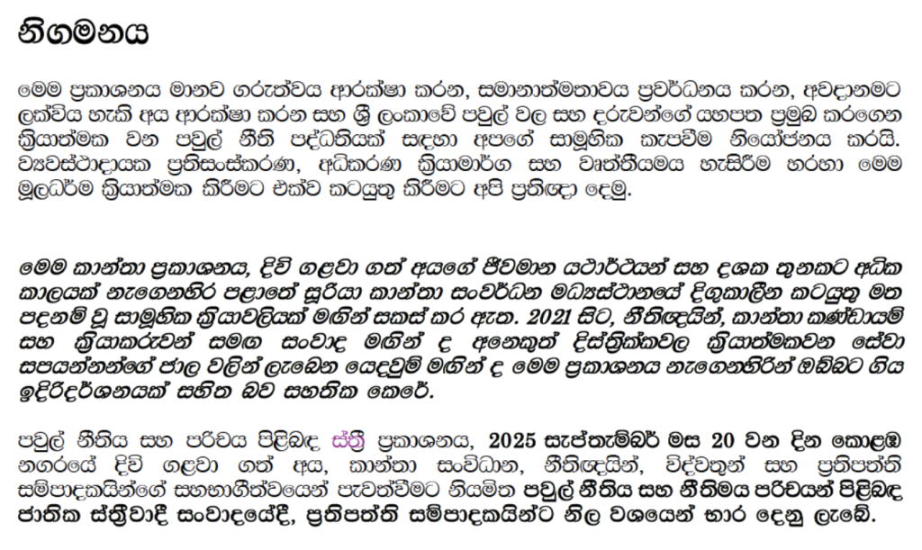 පවුල් නීතිය තුළ ස්ත්රීන් මුහුණ දෙන ගැටළු උතුරටත්, දකුණටත්, නැගෙනහිරටත්, බටහිරටත් පොදුය. ඒ නිසා මෙම ස්ත්රී වාදී ප්රකාශනයේ ඇති යෝජනා සැබෑ වෙනසක් කරා ගෙන යාමට බලපෑම් කිරීමට අපගේ වගකීමකි. පවුල් නීතිය පිළිබද ස්ත්රී ප්රකාශනය කියවා බලා ඔබේ අත්සන මෙයට එකතු කරන්න. සැමට සමාන නීතියක් වෙනුවෙන් සටන් කිරීම අපගේ අයිතියකි.