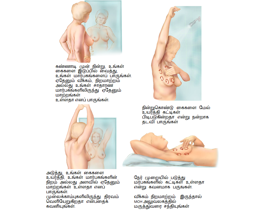 உங்களுக்கு அருகிலுள்ள சுகாதார மருத்துவமனையில் மார்பகப் பரிசோதனை செய்து கொள்ளலாம். 35 வயதுக்கு மேற்பட்ட பெண்கள் மருத்துவ மார்பகப் பரிசோதனை செய்து கொள்ள வேண்டும்.